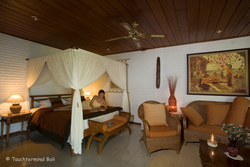 Das Tauch Terminal Tulamben Resort befindet sich eingebettet in einem Garten voll exotischer Pflanzen und Palmen. Zur Auswahl stehen die komfortablen Unterkünfte als Bungalows oder stilvolle Deluxe Zimmen – natürlich alle mit Meeresblick. Das Resort befindet sich an Balis-Nordostküste und wurde von Tauchern für Taucher gestaltet, welche dem Rummel, Verkehrsstaus und Massentourismus entkommen und Ruhe und Entspannung tanken wollen.
