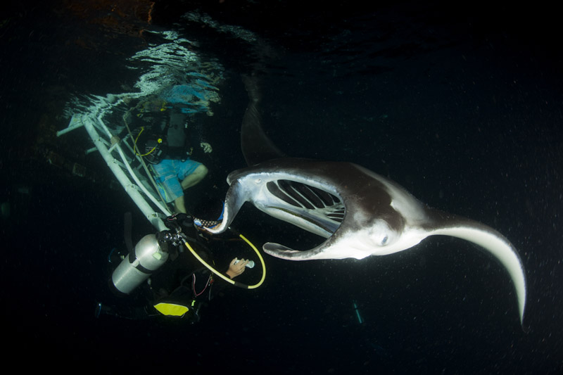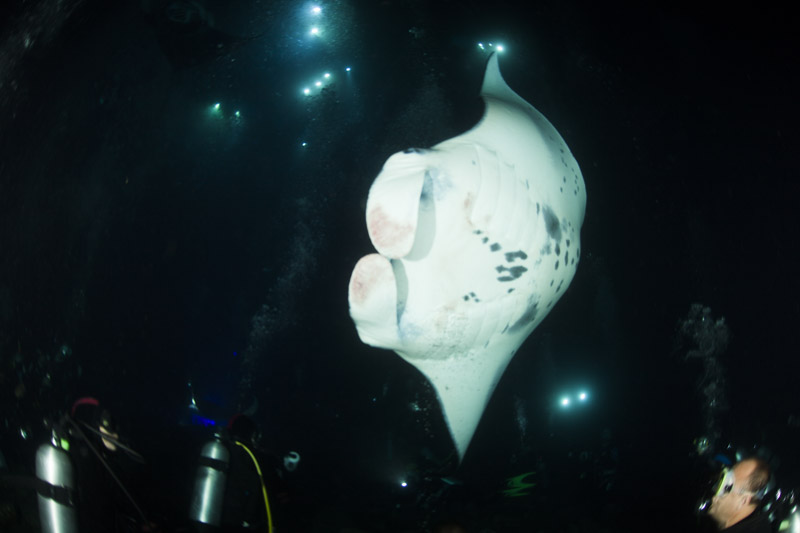 Tipp: Die gleiche Idee hatte man auch auf den Malediven und einige Schiffe bieten dir ein ähnliches fantastisches Schauspiel, indem sie einfach die Scheinwerfer abends hinter der Tauchplattform ins Wasser richten. Sehr schnell sammelt sich Plankton und meistens muss man nicht lange warten, bis Mantas und Walhaie ihre Runden ziehen. Sehr oft gesellen sich auch Ammenhaie dazu – ein wirklich lohnender Nacht-Tauchgang, auch wenn man „nur“ unter dem Schiff rumhängt. ;)