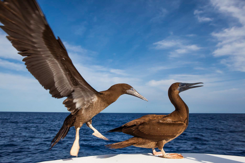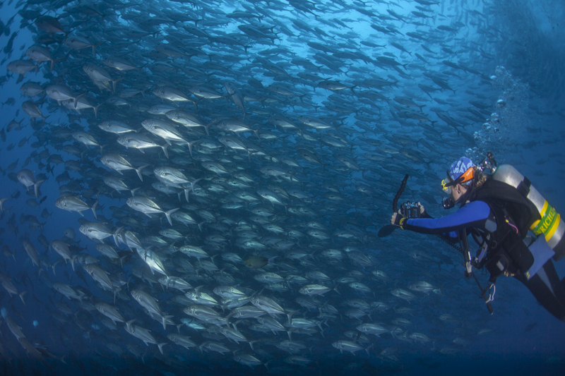 Die Hauptattraktion des Tauchens an der Cocos Insel sind Hammerhaie. Sie werden Zeuge von einer Welle nach der anderen, an großen Gruppen von Hammerhaien, einige zählen in den Hunderten! Aber es gibt regelmäßige Begegnungen mit anderen Haiarten, vor allem Weissspitzen-Riffhaie und Galapagoshaie, Seidenhaie, Tigerhaie, Schwarzspitzenhaie, Silberspitzenhaie und Gitarrenhaie. Sie werden von vielen verschiedenen Arten von Rochen begleitet: Mobula, Marmor, Manta und Adlerrochen wirbeln um Sie herum, auf der Suche nach Reinigungsstationen.