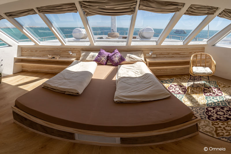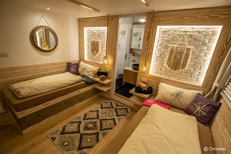 Die Omneia Soul bietet 15 Kabinen, die sich über drei Decks verteilen. Alle Kabinen sind mit Klimaanlage, Kühlschrank und eigenem Badezimmer mit Regenduschen ausgestattet.