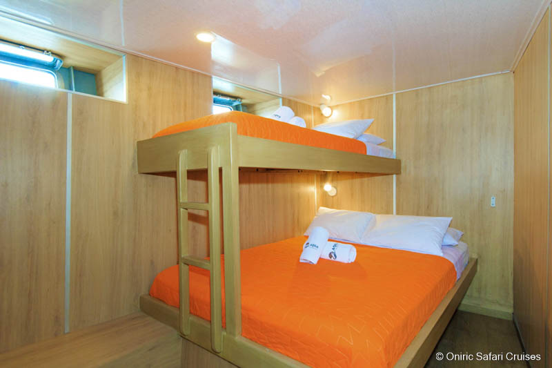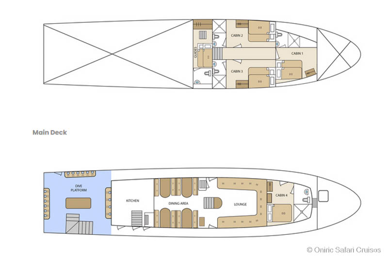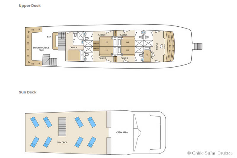 Die Aqua ist ein klassisches Stahlschiff mit drei Decks und einer Gesamtkapazität von 16 Gästen. Sie verfügt über neun Kabinen, die jeweils etwa 10 m² groß sind. Auf dem Unterdeck befinden sich drei Kabinen mit einem Doppelbett unten und einem Einzelbett oben, ideal für Doppel- oder Dreierbelegung. Das Hauptdeck bietet eine Kabine mit Doppelbett, während das Oberdeck fünf Kabinen beherbergt – vier mit zwei Einzelbetten in Stockbett-Anordnung und eine mit Doppelbett. Alle Kabinen sind klimatisiert und verfügen über ein eigenes Bad mit Warmwasserdusche.