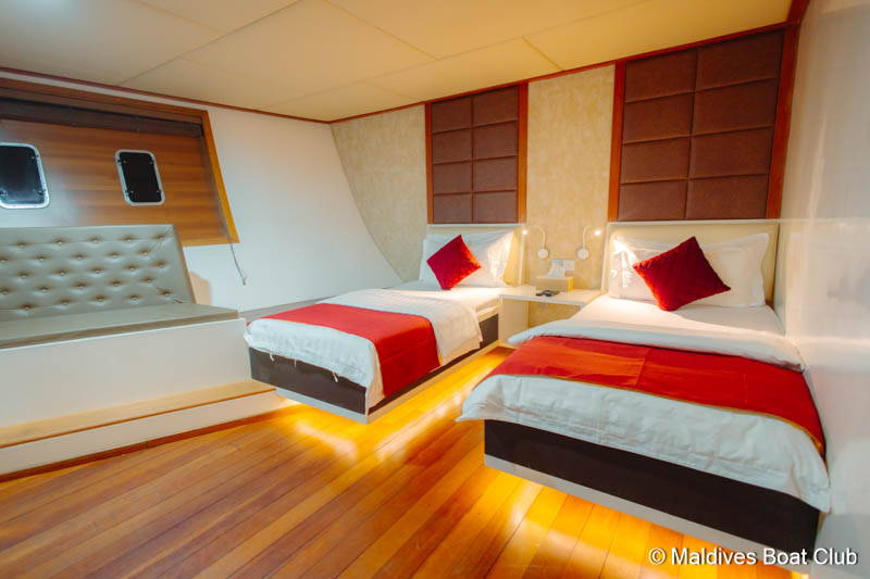 Alle Tauchaktivitäten finden von dem 20 m langen Tauchboot, einem traditionellen Dhoni, aus statt. Hier wird die Tauchausrüstung gelagert und das Dhoni bietet Platu für 30 Taucher. Zur Verfügung stehen neben ausreichend Stauraum natürlich auch Spültanks, Duschen und eine Toilette. Die Flaschen werden auf dem Dhoni in Sichtweite des Schiffs aufgefüllt, sodass du nicht beim Entspannen auf dem Safarischiff gestört wirst.