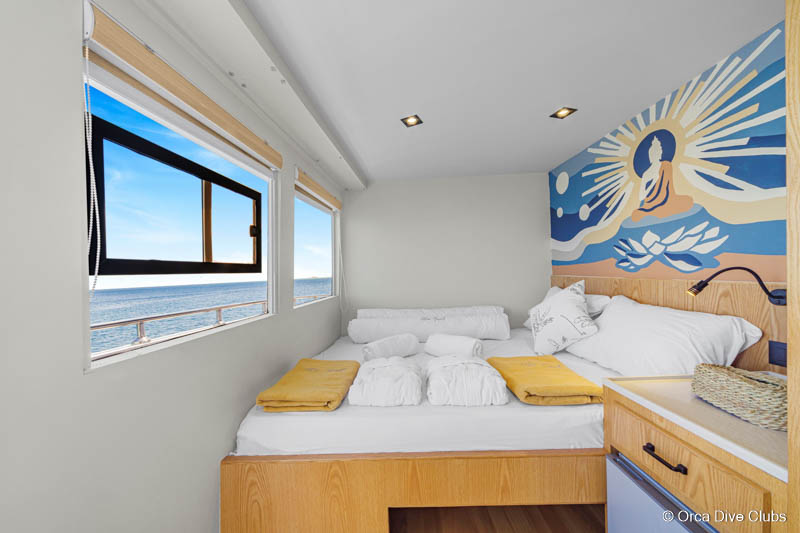 Sie verfügt die über zehn großzügige Kabinen und kann bis zu 20 Gäste beherbergen. 6 Doppelkabinen befinden sich im Unterdeck, 2 weitere Doppelkabinen sowie zwei Kabinen mit Queensize-Betten sind auf dem Oberdeck untergebracht. Alle Kabinen sind klimatisiert und mit einem eigenen Bad mit Dusche und WC ausgestattet. Handtücher und Bademäntel werden zur Verfügung gestellt. Tageslicht und natürliche Belüftung sorgen durch die Bullaugen für ein angenehmes Raumgefühl.