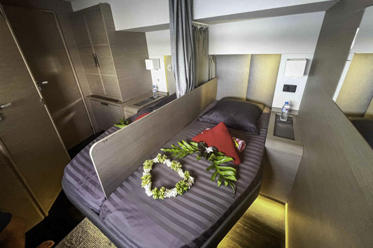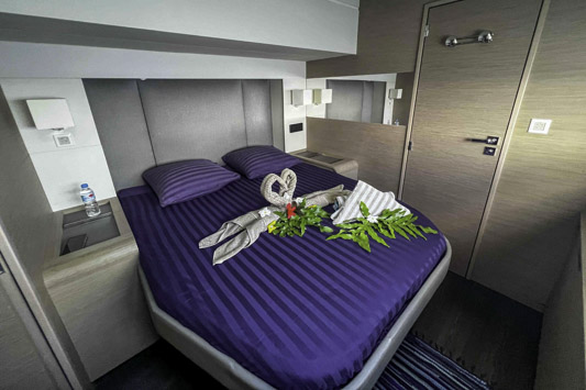 Das komfortable und geräumige Schiff bietet Platz für eine kleine Gruppe von Gästen, sodass 8–10 Personen in 4–5 Doppelkabinen untergebracht sind. Vier Doppelkabinen befinden sich in den beiden Auslegern und sind direkt vom Salon aus zugänglich. Sie verfügen über große Panoramafenster mit kleinen, zu öffnenden Luken sowie große Dachluken, die bei ruhiger Fahrt und vor Anker geöffnet bleiben können. Jede Kabine ist mit einem eigenen Badezimmer mit Dusche und WC, ausreichend Stauraum sowie TV und Lademöglichkeiten für elektronische Geräte ausgestattet. Zwei der Doppelkabinen lassen sich mithilfe einer Trennwand und eines Vorhangs in zwei Einzelbetten unterteilen, sodass sie mehr Privatsphäre bieten.
