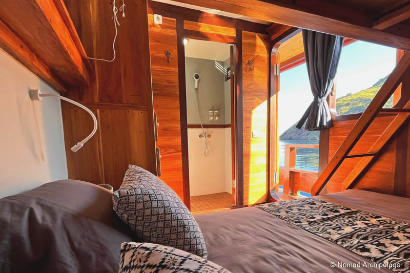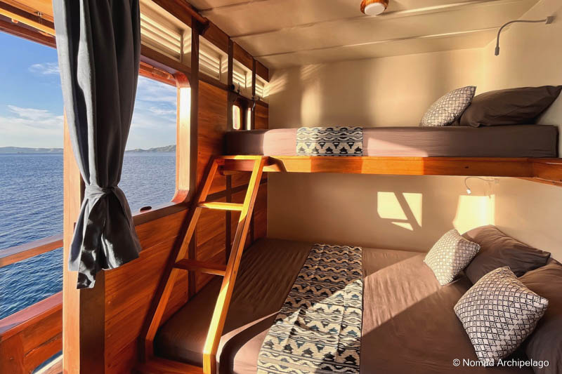 Die Bugis ist ein 27 Meter langes und 6,2 Meter breites traditionelles Phinisi-Holzschiff, das 2022 mit einem Fokus auf Nachhaltigkeit, Komfort und Sicherheit gebaut wurde. Sie bietet Platz für bis zu acht Erwachsene und vier Kinder in vier identischen Kabinen, die sich alle auf dem Hauptdeck befinden. Jede Kabine verfügt über ein Doppelbett (140 x 200 cm) und ein darüberliegendes Einzelbett (90 x 200 cm), was sie ideal für Paare, Freunde oder Familien mit Kindern macht. Die Kabinen sind gut isoliert, verfügen über große Fenster für natürliche Belüftung und sind mit Deckenventilatoren ausgestattet.