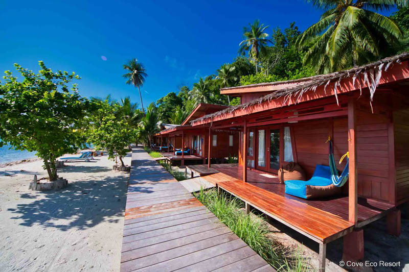 Das Cove Eco Resort liegt auf der Privatinsel Yeben im Herzen von Raja Ampat, umgeben von weißen Sandstränden, türkisfarbenem Wasser und unberührten Korallenriffen. Die kleine Anlage mit komfortablen Ocean-View-Cottages verbindet nachhaltiges Design mit familiärer Atmosphäre und bietet Vollverpflegung in idyllischer Abgeschiedenheit.