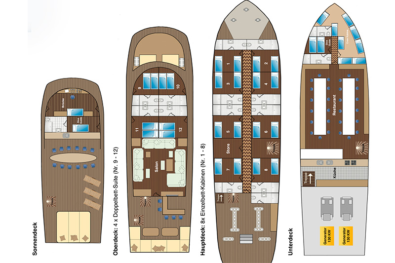 Auf dem ersten Oberdeck befindet sich, neben den bereits genannten Doppelbett-Kabinen, auch ein gemütlicher und klimatisierter Salon, welcher für die Briefings an Bord genutzt wird, jedoch auch zwischen den Tauchgängen zum Verweilen einlädt. Im Außenbereich des ersten Oberdecks, fast als Herzstück dieses Decks, ist eine Bar mit großzügiger Sitzecke zu finden, an der sich meist alle Gäste zum gemeinsamen Ausklang des Tauchtages treffen. Alle Decks sind in den Außenbereichen mit edlem Teakholz belegt.
