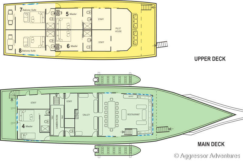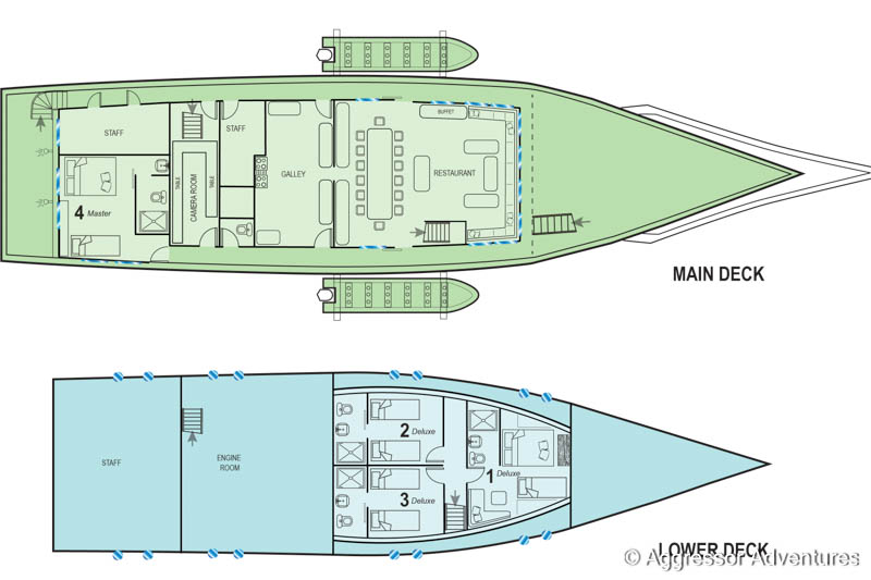 Alle Mahlzeiten werden täglich frisch zubereitet, serviert werden sie im Salon am Hauptdeck. Gerne nimmt das Personal Rücksicht auf individuelle Ernährungsbedürfnisse. Die Aggressor-Flotte ist für ihre ausgezeichnete Küche bekannt.