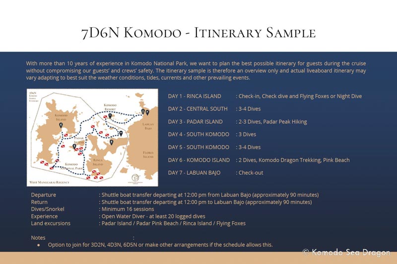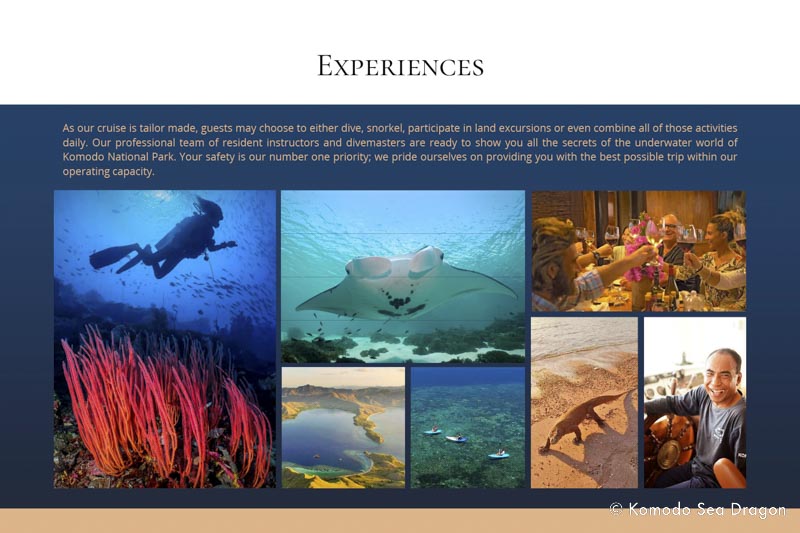 Die Komodo Sea Dragon bietet 2-6 Nächte Tauchsafaris in einem der neuen 7 Naturwunder und UNESCO-Weltkulturerbe an. Mit einem separaten Begleitboot, von dem aus alle Tauch- und Schnorchel-Aktivitäten durchgeführt werden, und dem Hauptschiff, das nur für die Unterbringung genutzt wird, wurde ein einzigartiges Liveaboard-Konzept in der Region eingeführt, das unvergleichlichen Komfort, Platz und erhöhte Sicherheit bietet.