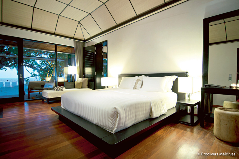 Die 69 Beach-Villen sind entlang des Strandes gereiht. Jeder Bungalow hat 2 Wohneinheiten, halboffenem Bad mit Dusche/WC, Badewanne mit Whirlpool, Außendusche, Föhn, Klimaanlage, Deckenventilator, Flat-TV, CD-/DVD Player, Telefon, WLAN (kostenfrei), Minibar, Kaffee-/Teekocher, Espressomaschine, Terrasse mit Liegen, teilweise Meerblick. Die Beach Family Villa ca. 136 m² besteht aus zwei Beach Villen mit Verbindungstür.