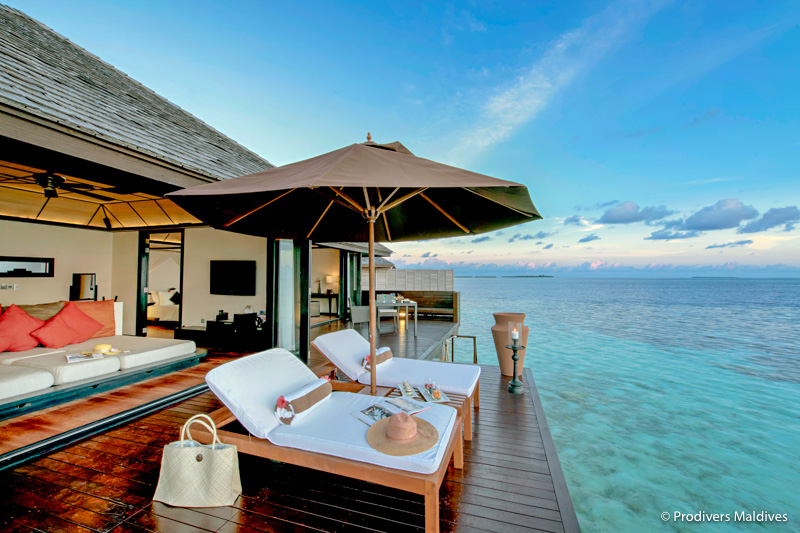 Die 4 Sunset Water Suiten befinden sich auf der Sonnenuntergangsseite über dem Wasser und verfügen über einen separaten Sitzbereich mit Tagesbett, 14 m² privater Whirlpool-Pool, 24-Stunden Butler Service.