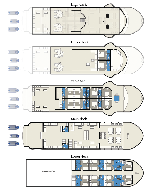 Auf dem High Deck und dem Oberdeck befinden sich Sonnenliegen zur Entspannung. Auf dem Oberdeck sind auch 2 Suiten und ein beschatteter Sitzbereich. Das Sonnendeck verfügt über einen Loungebereich am Heck, 4 Suiten und 4 Doppelkabinen und einen Jacuzzi am Bug. Am Hauptdeck befinden sich der voll klimatisierte Salon und Speisesaal. Der entspannende Innenbereich ist ausgestattet mit einem 65" Fernseher, DVD, Soundsystem und Wi-Fi. Auf dem Hauptdeck befindet sich auch eine kleine Bar mit Kühlschrank und Wasserspender. Die weiteren 6 Doppelkabinen befinden sich am Unterdeck.