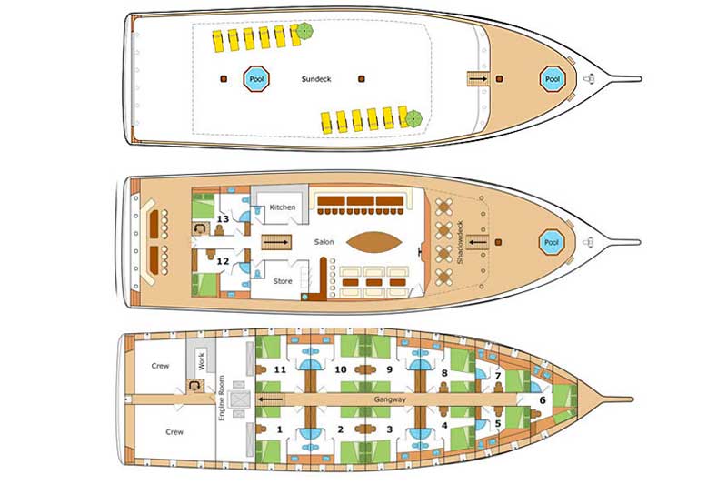 In 12 geräumigen, modernen Gästekabinen finden bis zu 24 Gäste während der Tauchsafari eine luxuriöse Unterkunft. Bei Gruppenreisen gibt es die Möglichkeit 9 Kabinen mit 3 Personen zu belegen - wir empfehlen aufgrund des Platzangebotes z.B. beim essen und am Dhoni etc. aber nur wenige Kabinen mit mehr Personen zu belegen. Die Kabinen der Nautilus Two sind mit 20 m² so groß wie auf kaum einem anderen Safariboot auf den Malediven. Sie verfügen über ein Kingsize-Doppelbett oder zwei Einzelbetten, ein 6 m² großes Badezimmer mit Seitenfenstern, einen Schreibtisch mit Schubladen und Hocker, einen Spiegel, einen großen Kleiderschrank, Ablagemöglichkeiten, ausreichend Stauraum und natürlich eine separat regelbare Klimaanlage. Solltest du keine Klimaanlage wünschen, so sorgen eine große Deckluke und eine Seitenluke in den Kabinen für ausreichend Ventilation und versorgen die Räume gleichzeitig mit Tageslicht. Das große Badezimmer ist mit einem großen Waschtisch mit Spiegel, einer luxuriösen Duschkabine, sowie eine Toilette ausgestattet. 2 Kabinen liegen auf dem Hauptdeck, der Rest auf dem Unterdeck.