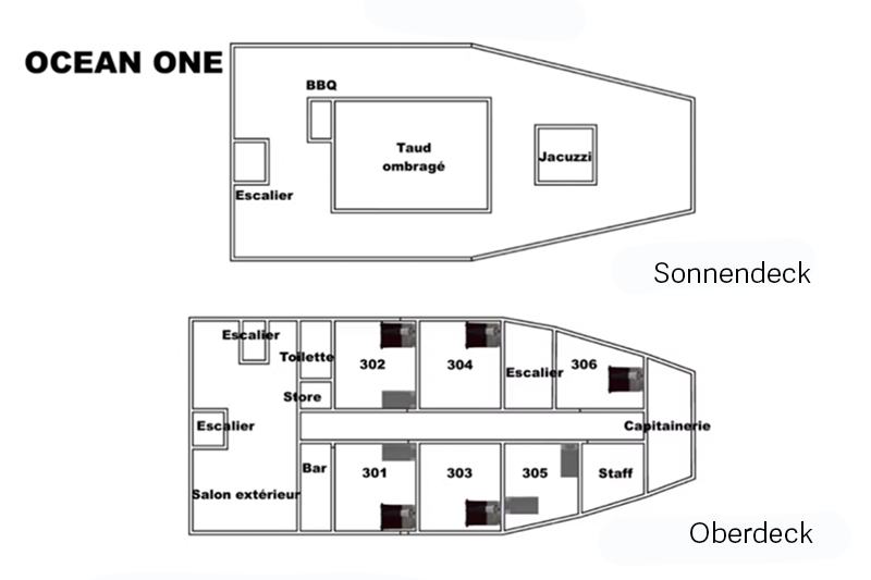 Und schließlich befindet sich auf dem obersten Deck ein schattiges „Sundeck“ mit Liegestühlen, Hängematten und einem Whirlpool mit 7 Plätzen. Ocean One bietet alle Annehmlichkeiten für den Komfort und das Wohlbefinden seiner Passagiere.