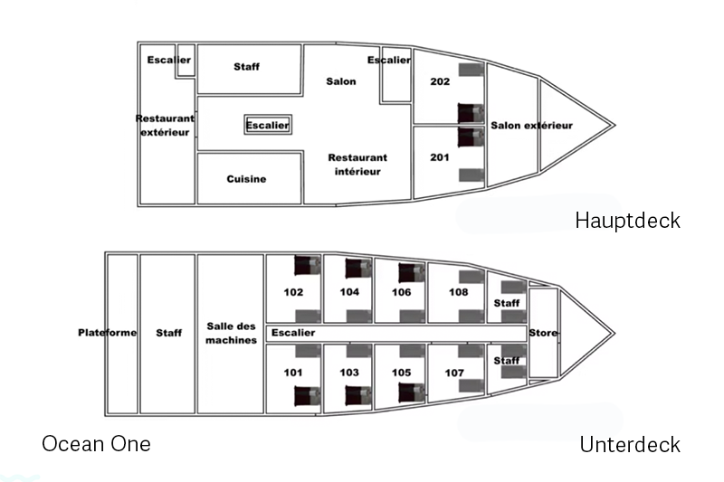 7 Standardkabinen mit Bullaugen befinden sich auf dem unteren Deck. Kabine 101 bis 106 verfügen über ein Doppelbett und ein Einzelbett. Kabine 107 hat 2 Einzelbetten. Auf dem Hauptdeck findest du 2 Panoramakabinen (201 und 202), die einen wunderschönen Blick auf das Meer bieten. Beide sind ebenfalls mit einem Doppelbett und einem Einzelbett ausgestattet. Schließlich befinden sich noch 6 Seaview-Kabinen auf dem Oberdeck. Einige sind mit einem Doppelbett und einem Einzelbett (301 und 302) ausgestattet, andere nur mit einem Doppelbett (303, 304 und 306 und die letzte mit zwei Einzelbetten (305).