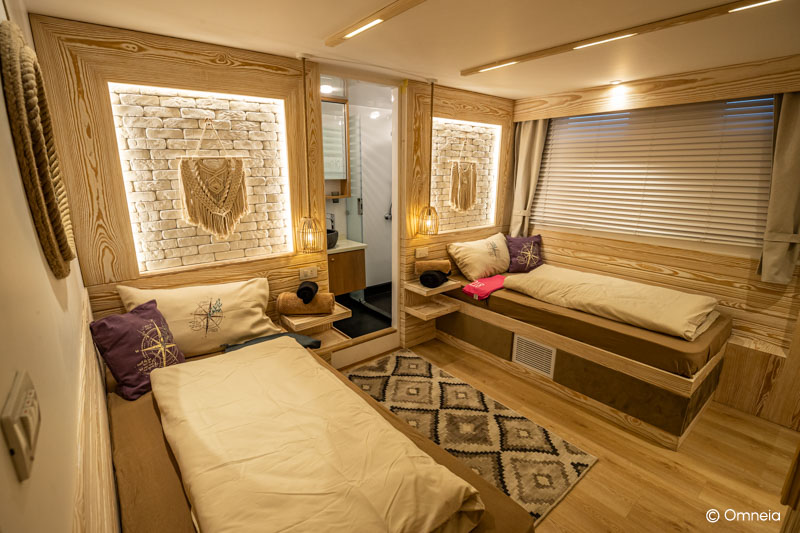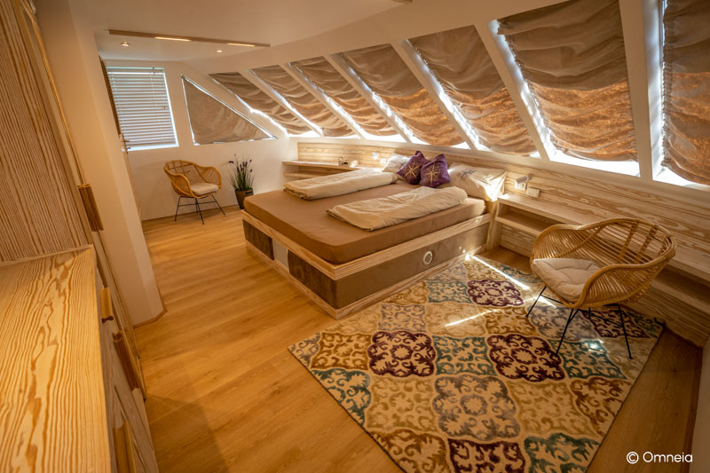 Die Omneia Soul ist ein 43 Meter langes und 9,5 Meter breites Stahlschiff mit drei Decks, das 2021/2022 gebaut wurde. Auf dem Hauptdeck befinden sich fünf Twin-Kabinen, zwei Suiten und eine Einzelkabine, während das Unterdeck fünf Twin-Kabinen und eine Suite bietet. Zusätzlich gibt es auf dem Oberdeck eine großzügige Mastersuite. Alle Kabinen sind klimatisiert und verfügen über eigene Badezimmer. Die Betten sind überwiegend als Twin-Betten konfiguriert, in den Suiten findest du komfortable Doppelbetten.