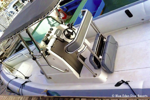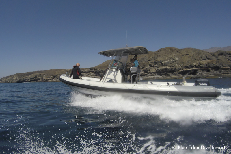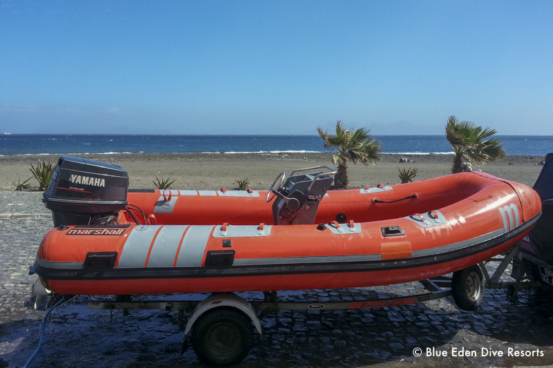 Morgens wird der Pickup beladen und bereits im Anzug geht es zum 3 Minuten entfernten Hafen Porto Novo. Dort starten die großen Zodiaks zu den Tauchplätzen, die zwischen 10 und 40 Minuten entfernt sind. Üblicherweise gibt es vormittags einen Doppeltank mit Mittagspause am Boot und nachmittags nochmals einen Tauchgang.