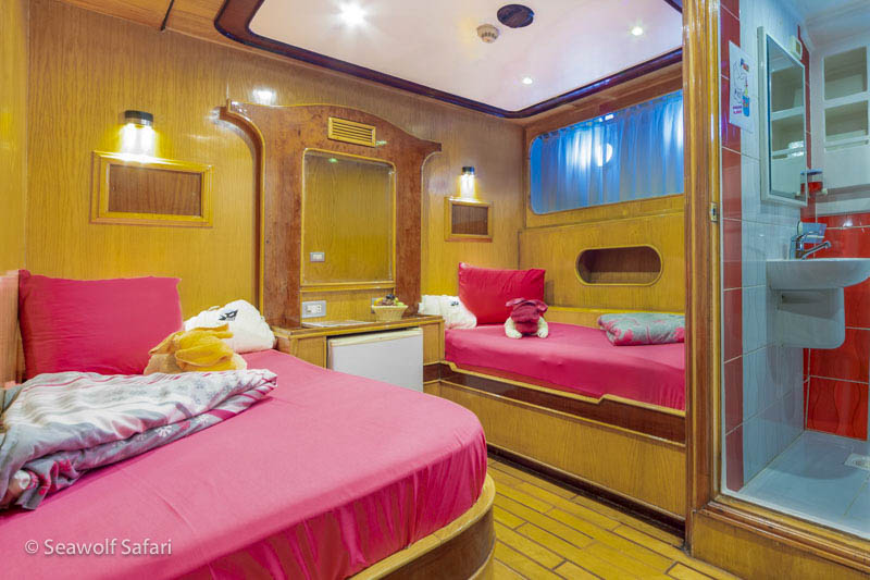 Das Boot verfügt über 9 Doppelkabinen und 3 Suiten und bietet Platz für 24 Taucher. Alle Kabinen verfügen über ein eigenes Badezimmer, Minibar, individuell einstellbare Klimaanlage und ein Soundsystem. 8 Doppelkabinen liegen auf dem Unterdeck, eine Doppelkabine liegt auf dem Oberdeck und die 3 Suiten liegen auch auf dem Oberdeck.
