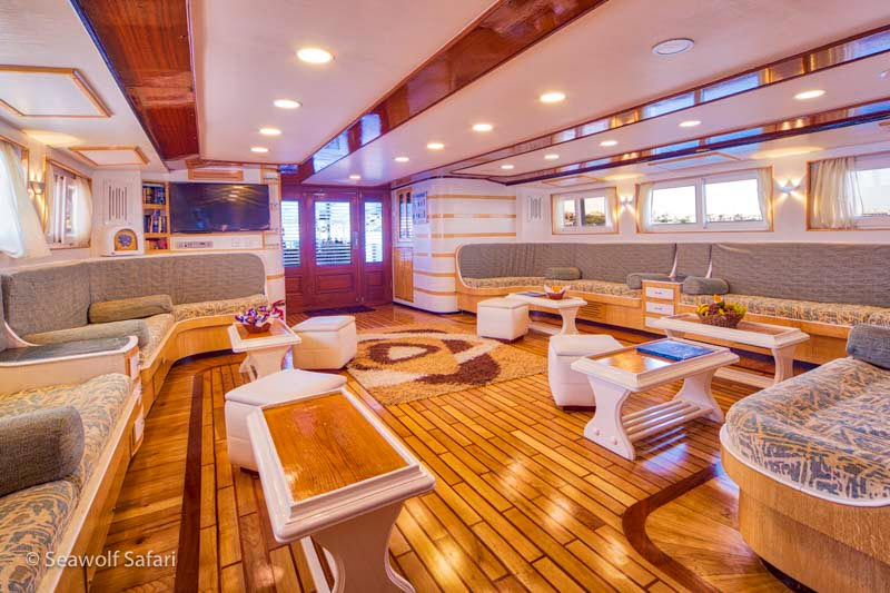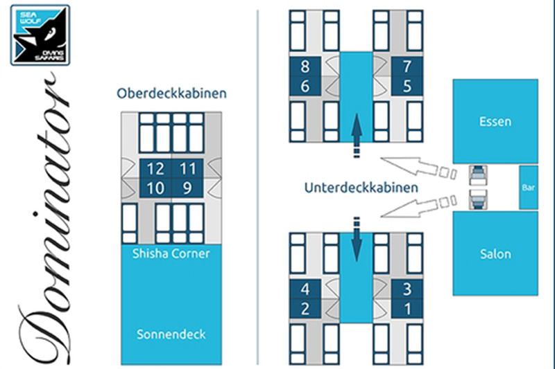 MY Seawolf Dominator ist ein 42 m langes und 8,5 m breites Boot. Es verfügt über 9 Doppelkabinen und 3 Suiten mit jeweils eigenem Bad und individuell regulierbarer Klimaanlage und bietet Platz für 24 Taucher.