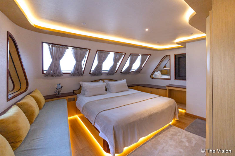 Auf dem Hauptdeck befindet sich die großzügige Vision Master Suite mit Queensize-Doppelbett, Panoramafenstern, viel Stauraum und einem privaten Badezimmer. Im Unterdeck liegen die Oceanview Suite mit Queensize-Doppelbett sowie vier weitere Kabinen: zwei Explorer Plus Kabinen mit zwei Einzelbetten und einem versteckten Bunkbed (flexibel nutzbar als Twin oder Doppelbett) sowie zwei Explorer Kabinen mit klassischen Twin-Betten. Alle Kabinen sind klimatisiert und verfügen über ein eigenes Bad mit Dusche und WC.