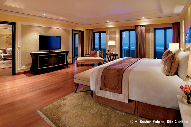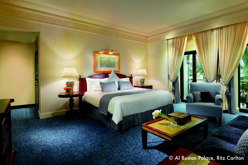 Das Al Bustan Palace Ritz Carlton liegt inmitten einer grünen Palmenoase, direkt an einem ca. 1 km langen Sandstrand mit Blick auf den majestätischen Golf von Oman und ist eines der schönsten Palasthotels weltweit. Mit dem bizarren Hajar Gebirge im Hintergrund bietet es eine außergewöhnliche und traumhaft schöne Kulisse.