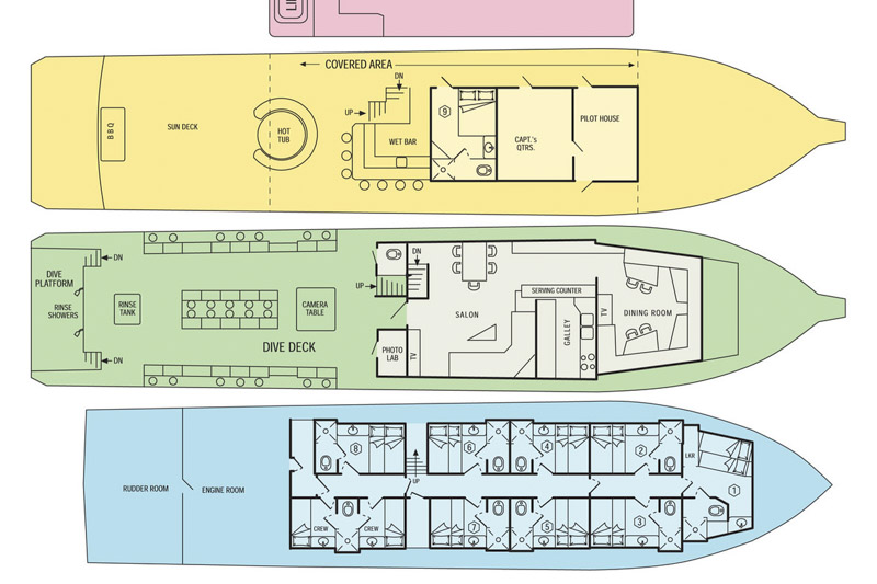 Die Belize Aggressor III ist ein komfortables Stahlschiff mit mehreren Decks, das speziell für Tauchsafaris konzipiert wurde. Auf dem Hauptdeck befinden sich der Salon, das Restaurant und der Zugang zum Tauchdeck.