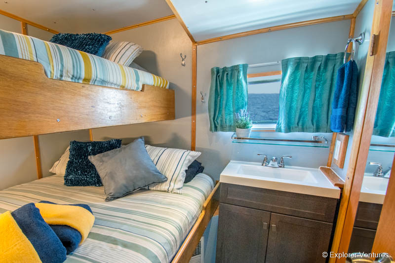 Das Schiff erstreckt sich über mehrere Decks: Das Unterdeck beherbergt Staterooms 5–9 mit jeweils privatem Bad; vorne finden sich Portholes. Das Hauptdeck umfasst Staterooms 1–4, die entweder eine Queen, Queen + Twin oder Twin-Kojen bieten; außerdem befindet sich hier auf dem Flur eine kleine Boutique. Alle neun Gästekabinen verfügen über individuell regelbare Klimaanlage, private Badezimmer mit Dusche und WC, Stauraum sowie Fenster oder Portholes. Die Bettenkonfiguration ist vielseitig: Zwei Kabinen mit Doppelbett, vier Kabinen mit Queen und darüber Twin, drei Kabinen mit Twin-Etagenbetten.