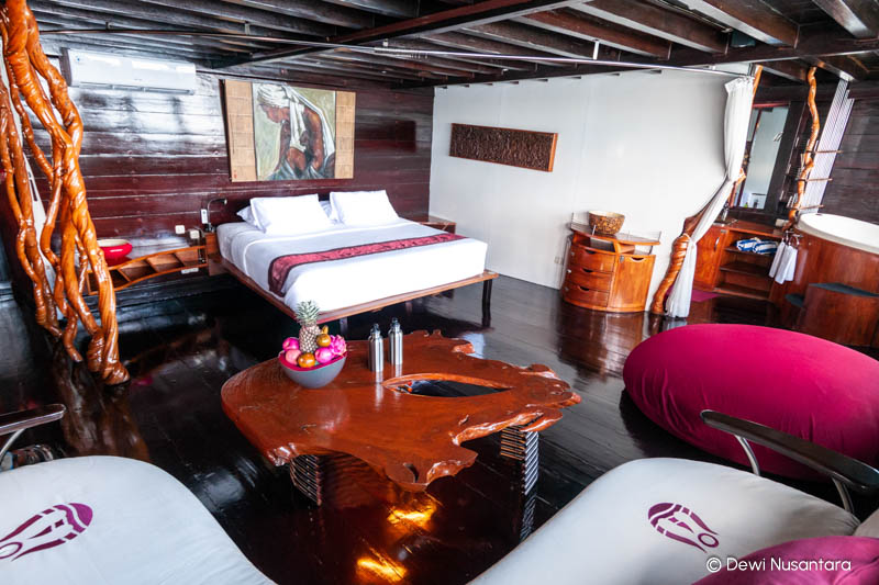 Der im Jahr 2008 vom Stapel gelaufene Motorsegler „Dewi Nusantara“ ist mit ihren 58 Metern Länge und 12 Metern Breite eines der größten und luxuriösesten Tauchsafarischiffe in Indonesien und bietet somit viel mehr Platz als andere Schiffe. Die Yacht ist ganz aus Holz, in der Bauweise eines traditionellen indonesischen Schoners gefertigt und bietet 18 Tauchern Platz.