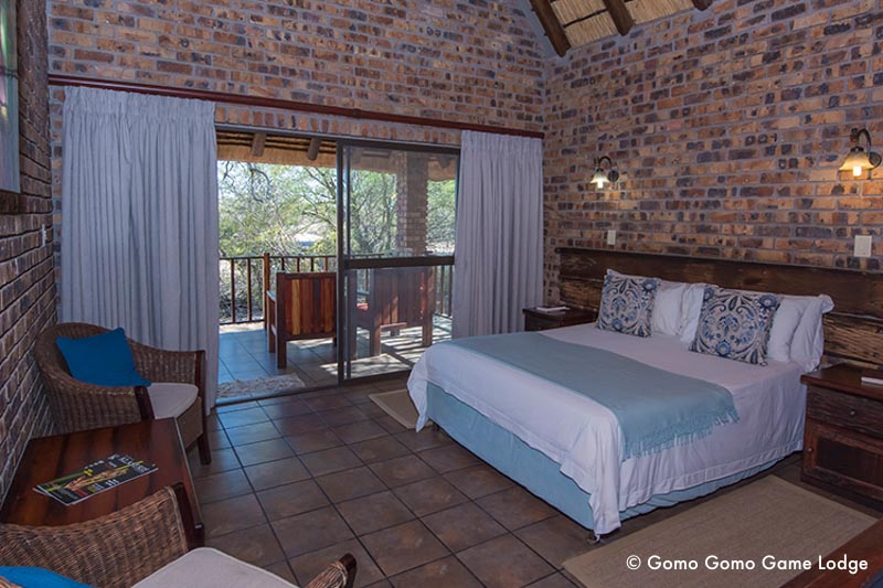 Die Gomo Gomo Game Lodge liegt direkt am Nhlaralumi-Fluss und bietet eine spektakuläre Aussicht auf die umliegende Wildnis. Die Unterkunft besteht aus fünf strohgedeckten Chalets für jeweils zwei oder vier Gäste sowie vier Luxuszelten im ostafrikanischen Stil. Alle Chalets sind modern eingerichtet und verfügen über Bad und WC, Terrasse, Minibar, Deckenventilatoren, Fliegengitter an Türen und Fenstern sowie 240-Volt-Stromanschluss. Die Zelte sind traditionell gebaut und bieten ein authentisches Safari-Gefühl mit hohem Komfort. Eine große Aussichtsveranda ermöglicht einen 180°-Blick auf den Fluss und das Wasserloch, an dem regelmäßig Elefanten und andere Tiere erscheinen.