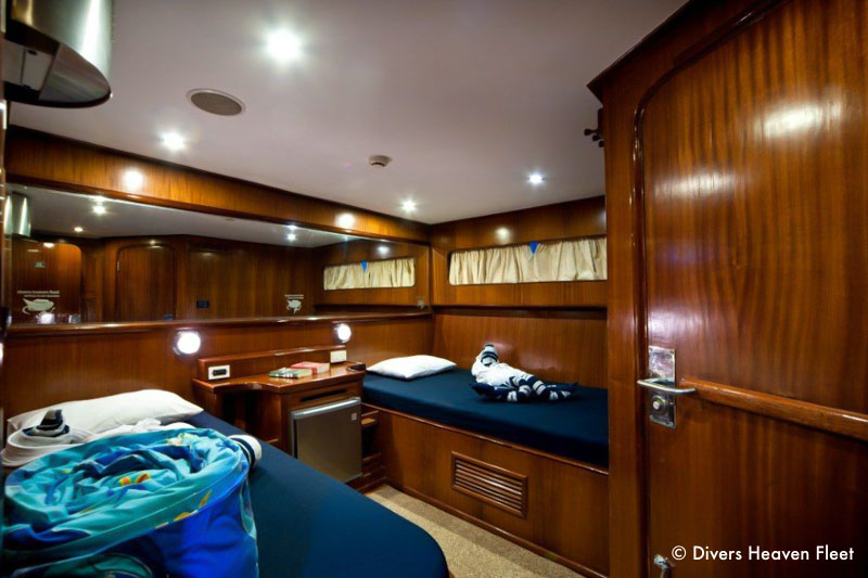 Die Heaven Saphir ist ein 36 Meter langes Stahlschiff mit drei Decks und großzügigen Gemeinschaftsbereichen. Auf dem Unterdeck befinden sich sechs Standardkabinen mit Twin-Betten, Klimaanlage, Kühlschrank und eigenem Bad (je ca. 10 m²). Das Oberdeck bietet drei Honeymoon-Suiten mit Doppelbetten (13 m²), während die Executive Suite auf dem Mitteldeck mit 20 m² Platz für bis zu drei Personen bietet – ideal für Familien mit Kind. Alle Kabinen verfügen über Stauraum, Musiksystem und elektronisch gesteuerte Sanitäranlagen.