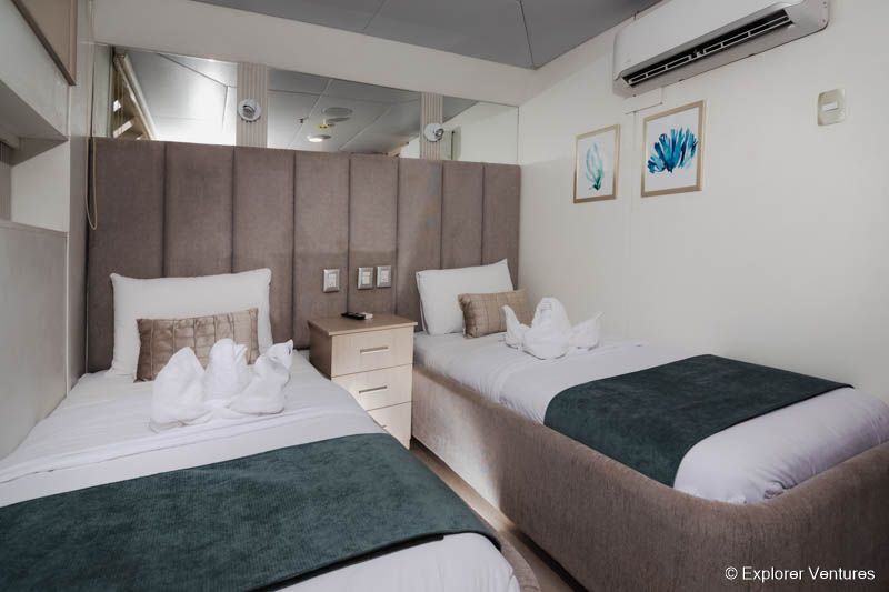 Es gibt 6 Kabinen auf dem Unterdeck und 2 Kabinen auf dem Hauptdecke - alle mit einem Queensize-Bett und Meerblick. Die Betten lassen sich in fast allen Kabinen (außer Kabine 3 und 4) problemlos in zwei Einzelbetten umbauen. Alle Kabinen haben ein eigenes Badezimmer (warmes Wasser und WC), Klimaanlage, Stauraum und Flachbildschirm TV/DVD.