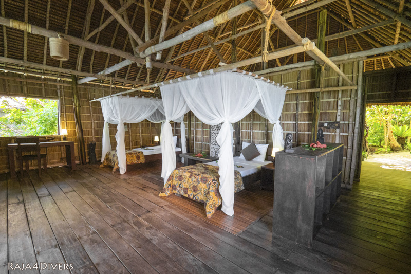 Die Unterkunft besteht aus 11 geräumigen Wasserbungalows, die alle im Papua-Stil mit lokalen Materialien erbaut wurden und bis zu 24 Gästen Platz bieten. Jeder Bungalow verfügt über ein Doppelbett und ist mit einem kleinen Ventilator, Minibar, Safe, 220-Volt-Steckdose und sogar einem iPad ausgestattet. Die Badezimmer sind zur Hälfte offen und verfügen über ein eigenes WC sowie Warmwasser aus einem traditionellen Mandi (Schöpfbad). Die privaten Terrassen mit Liegestühlen und Hängematte führen über ein paar Stufen direkt ins Meer. Bei Bedarf können die Bungalows mit zwei zusätzlichen Betten ausgestattet werden.