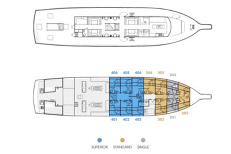 Die 6 Standard-Kabinen liegen im Unterdeck am Bug des Schiffes. Sie unterteilen sich in 4 Doppelkabinen und 2 Einzelkabinen. Die etwas größeren 6 Superior-Kabinen sind Doppelkabinen und liegen mittig am Unterdeck. Auf dem Hauptdeck findet man den Salon und das großzügige Tauchdeck. Auf dem Oberdeck wartet ein Sonnen & Schattendeck auf die Gäste.
