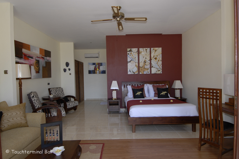 Das Resort verfügt über insgesamt 24 Zimmer, verteilt auf zwei Gebäude mit jeweils zwei Etagen. Die Zimmer sind entweder mit Garten- oder Meerblick buchbar und bieten eine angenehme Mischung aus Funktionalität und Komfort. Zur Ausstattung gehören Klimaanlage, Minibar, Safe, kostenloses WLAN, ein kleiner Balkon oder eine Terrasse sowie ein halboffenes Badezimmer mit Warmwasserdusche. Die Zimmer sind speziell auf die Bedürfnisse von Tauchern abgestimmt – mit ausreichend Platz für Ausrüstung und Kleidung, bequemen Betten und direktem Zugang zu allen Einrichtungen des Resorts.