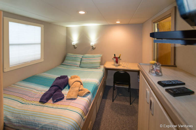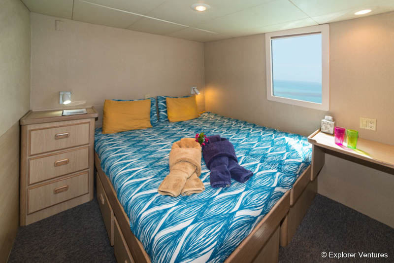 Alle zehn Kabinen haben ein privates Badezimmer mit Dusche, Waschbecken, WC und Haartrockner, individuell regelbare Klimaanlage, Kleiderschrank und Portlight-Fenster. Die Bettenkonfiguration lässt sich je nach Kabinentyp anpassen: Twin (zwei Einzelbetten) oder Doppel-Queen, wobei einige Kabinen auch als Twin/Queen kombinierbar sind, ideal für Paare oder Alleinreisende. Insgesamt sind bis zu drei Konfigurationen möglich: Twin-Etagenbetten, Twin/Queen oder Queen allein.