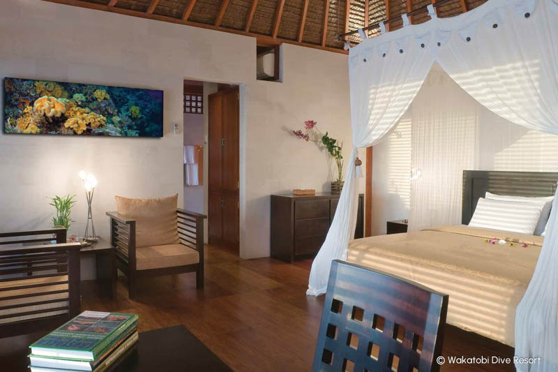 Es gibt 6 komfortable Wakatobi Villen sowie 3 verschiedene Kategorien von Bungalows, die sich von der Lage und Ausstattung aber nicht von der Größe unterscheiden. Die 18 Ocean-Bungalows bieten einen schönen Blick aufs Meer und liegen alle in der ersten Reise direkt am Strand. Die 6 Palm-Bungalows liegen leicht nach hinten versetzt in der zweiten Reihe und die 4 Turtle-Beach-Bungalows liegen mit Blick auf den Schildkrötenstrand. Die 4 Premium Villen haben eine bessere Ausstattung.
