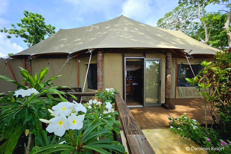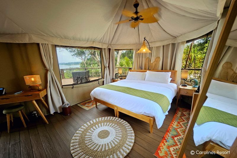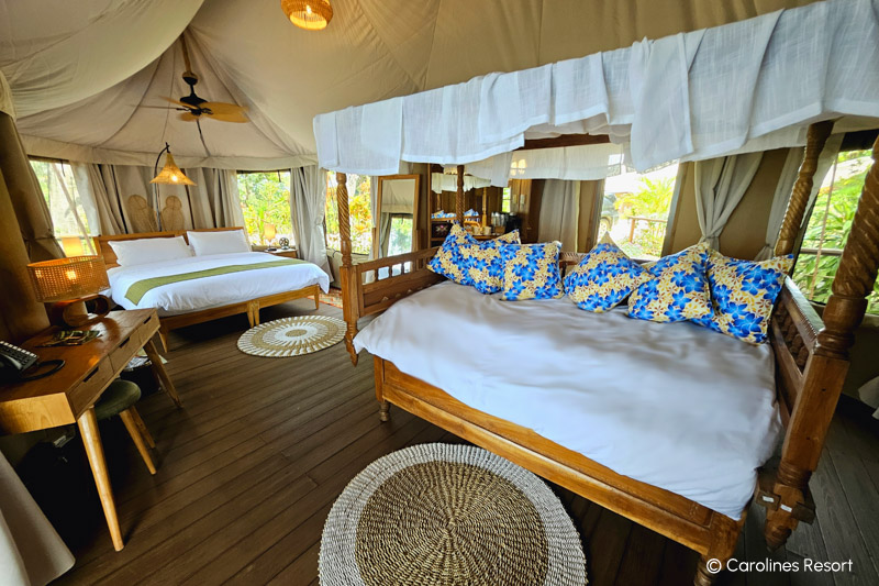 Das Palau Carolines Resort ist eine Oase der Ruhe und verfügt über 8 Bungalows und Luxuszelte. Die Luxuszelte sind eine unvergleichliche Mischung aus Abenteuer und Opulenz. Diese Zelte mit ihren weichen Wänden sind alles andere als gewöhnlich und definieren das Leben unter freiem Himmel mit ihrer großzügigen Innenausstattung und den sorgfältig handgefertigten Möbeln neu. Sie verfügen über eine Kingsizebett oder Einzelbetten, eine Schlafcouch, eine prächtige Kupferbadewanne, eine Regendusche im Freien, handgefertigte Plüschmöbel, eine private Terrasse mit Feuerstelle und viele mehr Annehmlichkeiten.