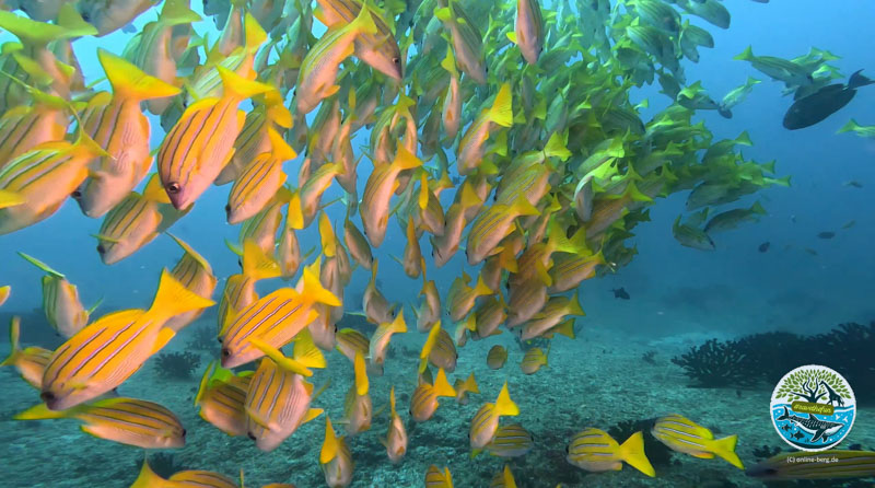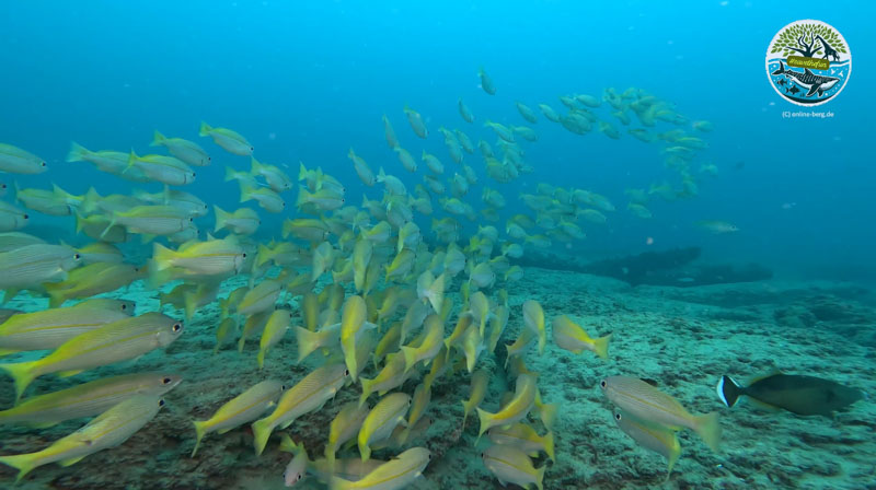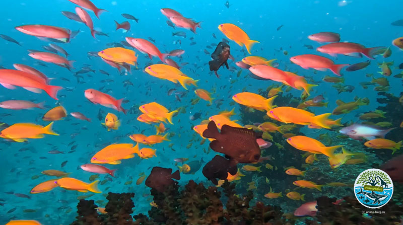 Die Tauchplätze schienen dank meiner Videoleuchte farbenfroh, ansonsten eher trüb. Wir hatten Sichtweiten von 10 bis 15 Meter und Wassertemperaturen von rund 25 – 26 Grad. Witterungsbedingt hatten wir überwiegend zwei Meter Welle und selten flachen Ozean. Daher haben wir von den zu der Jahreszeit üblichen vielen Manta und Walhai Begegnungen nur einen Manta gesehen. Dennoch haben wir viele Fischschwärme beobachten können.