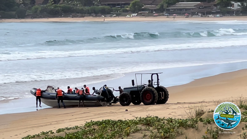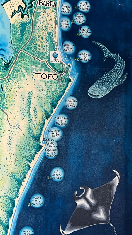 Das Tauchen mit dem Zodiac ist sehr rau. Mit Traktor wird das Boot bis zum Wasser gezogen. Die gesamte Crew einschließlich Gäste müssen dann das Boot so tief ins Wasser ziehen, dass die Motoren tief genug eintauchen und das Boot über die kräftigen Brandungswellen gleiten kann. In Tofo gibt es zwei Arten von Tauchgängen, den Deep Dive mit ca. 30 Meter oder den Shallow Dive mit ca. 15 Meter Tiefe. Beim Deep Dive endet dann der Tauchgang kurz vor Erreichen der Nullzeitgrenze mit Nitrox dann nach ca. 30 Minuten im Deep Blue. Zu beachten ist am Ende eines jeden Tauchtags die harte Landung am Strand, wenn das Zodiac mit Vollspeed auf den Strand auffährt und plötzlich zum Stehen kommt.