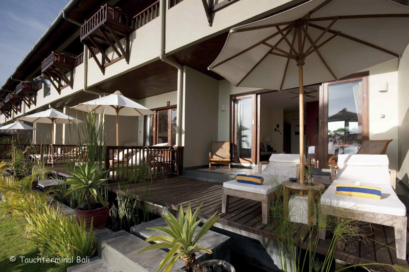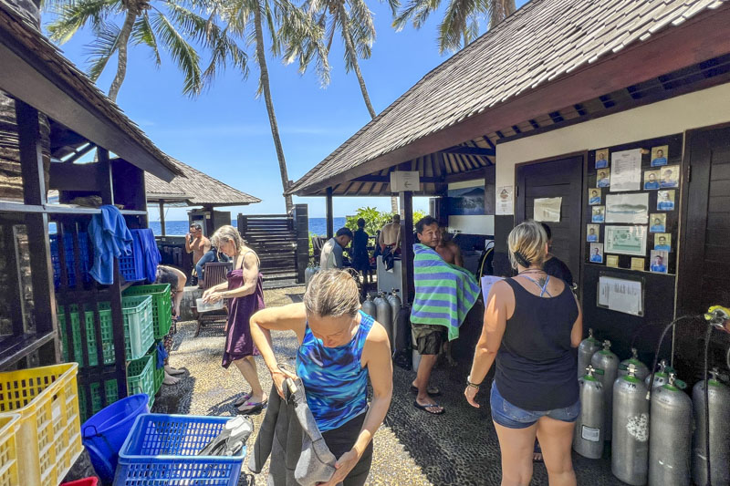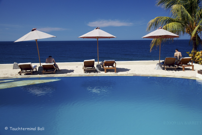 Gleich zu Beginn wohne ich in meinem absoluten Lieblings-Resort dem Tauchterminal in Tulamben. Eigentümer Axel Schwan und den zum „Inventar“ gehörenden Peter Moser kenne ich seit über 25 Jahren und wir hatten eine großartige Zeit zusammen. Der Tauchterminal gehört zu den gemütlichsten Resorts und die Basis ist höchst professionell. Die besten Spots Balis – die Liberty, ein Korallengarten, schwarzer Sand und ein mächtiger Drop Off - liegen direkt von der Türe. Taucherherz, was willst du mehr.