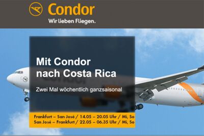 Condor bietet ab Oktober 2020 Nonstopflüge von Deutschland nach Costa Rica an. Die bisherige Zwischenlandung in Santo Domingo in der Dominikanischen Republik entfällt. Der Ferienflieger wird zweimal pro Woche – jeweils mittwochs und sonntags – von Frankfurt nach San José abheben.