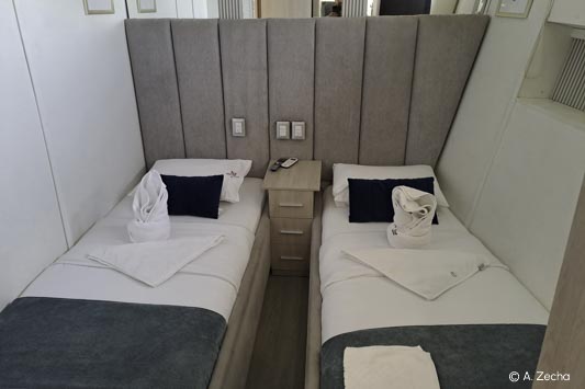 Zwei Zodiacs brachten uns dann in weiteren 10–15 Minuten zur Humbolt Explorer. Ein Stahlschiff, welches 2023 renoviert wurde. Das Schiff bietet für 16 Gäste Platz, jedoch hatten wir das Glück nur zu 11 zu sein. Somit konnte ich die Kabine 4 für die meiste Zeit alleine benutzen. Die erste Nacht teilte ich mir die Kabine mit einem anderen Gast, da noch versucht wurde, die Restplätze zu verkaufen. Da am Dienstag keine weiteren Gäste dazu kamen, wechselte mein Zimmergenosse und Tauchbuddy in die Nachbarkabine. Kabine 3 & 4 sind nur als Twin verfügbar. Alle anderen Kabinen sowohl als Twin als auch als Queen. Überdeck gibt es zwei Kabinen. Alle anderen sind Unterdeck.