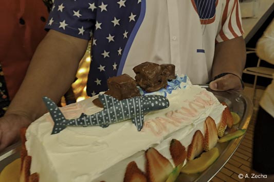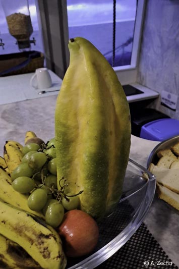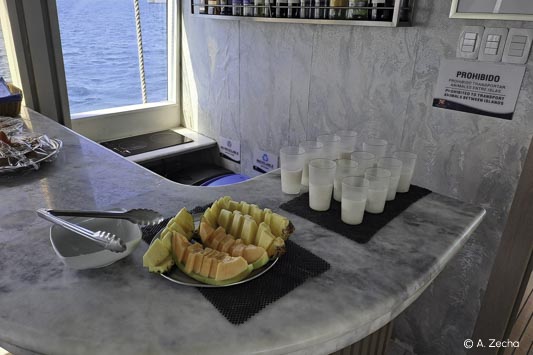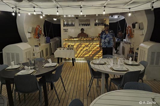 Verpflegung: Schon vor dem ersten Tauchgang gab es schon Kaffee. Und wer Hunger hatte, konnte sich einen Buttertoast oder Obst nehmen. Die Hauptmahlzeiten gab es in Buffetform. Ausgenommen: Zum Frühstück konnte man nach Wunsch sich sein Frühstücksei in allen möglichen Formen vom Koch bestellen. Auf spezielle Ernährungsbedürfnisse wird Rücksicht genommen. Getränke, sowohl alkoholisch als auch antialkoholisch sind immer verfügbar und inklusive.