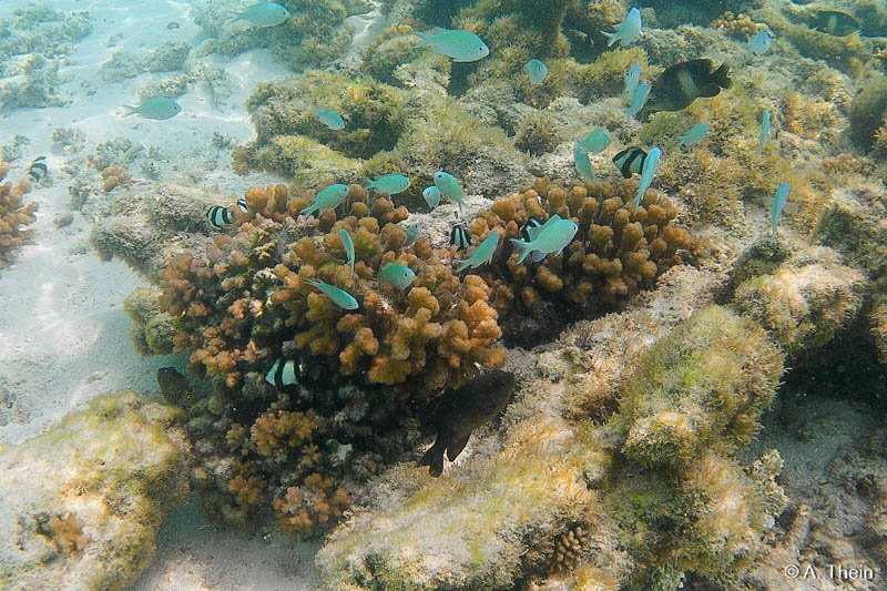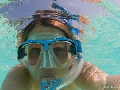Wir konnten Refresher & TryScuba gleich gemeinsam machen, was natürlich super war. Der Instruktor, bei uns Ila, nimmt sich wirklich ausreichend Zeit, erklärt die ganzen Komponenten und den Zusammenbau, wo mir sowieso nicht mehr alles klar war. Es werden die Zeichen besprochen und einige andere wichtige Dinge und dann wird sich angezogen und ab in die Lagune. In der Lagune gibt es dann die ersten praktischen Übungen, wie Maske ausblasen oder wie man mit der richtigen Armbewegung wieder an sein Mundstück kommt, falls man es mal verliert. ;)