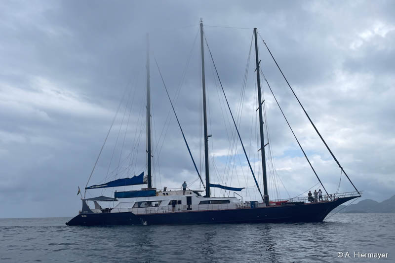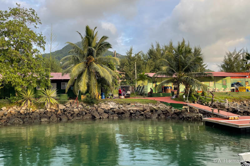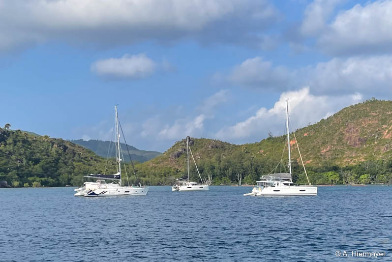 Die Bucht vor Curieuse Island war unser erster Stopp. Die Fahrzeit von Mahe betrug ca. 5 Stunden. Wir mussten aufgrund des Seeganges kreuzen. Normalerweise dauert die Überfahrt drei bis vier Stunden. Hier haben wir für zwei Nächte geankert. Es gibt eine Schildkröten-Station auf der Insel und ein Wanderweg mit einem langen Holzsteg führt durch die Mangroven zum Doctors House.
