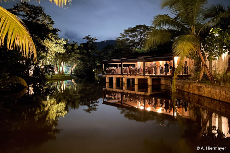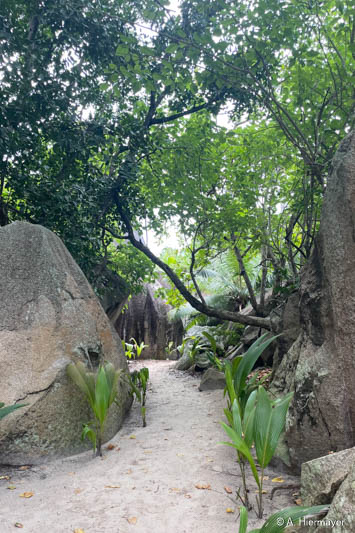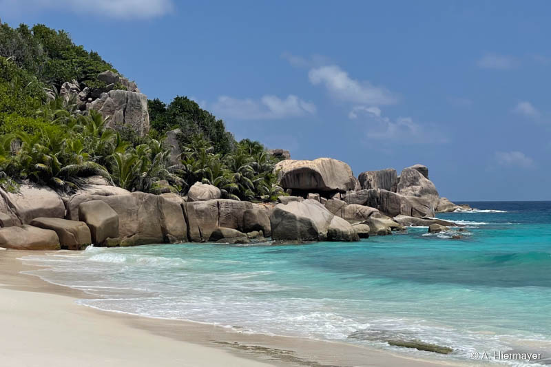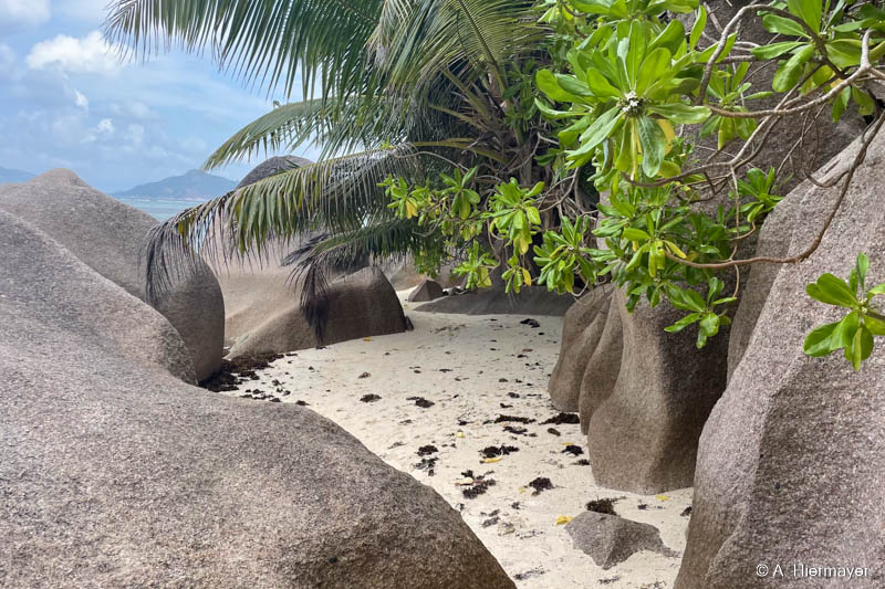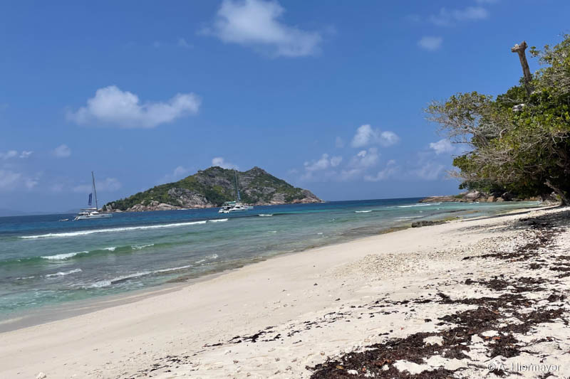 Auf Praslin nahmen wir an einer zweistündigen, sehr informativen Tour durch das Vallée de Mai mit Emmanuel von Masons Travel teil, der fließend Deutsch spricht. Der Strand Cote d’Or ist lang, mit feinem, hellem Sand, wird aber nicht gereinigt. Es lag etwas Seegras, aber kaum Müll. Entlang der parallel verlaufenden Straße gibt es kleine Shops, Bars, einen Supermarkt und einen Geldwechsel-Schalter.