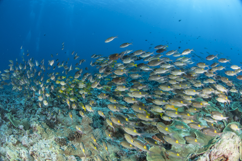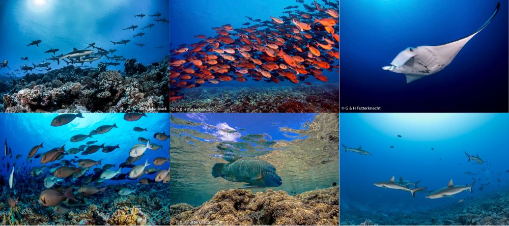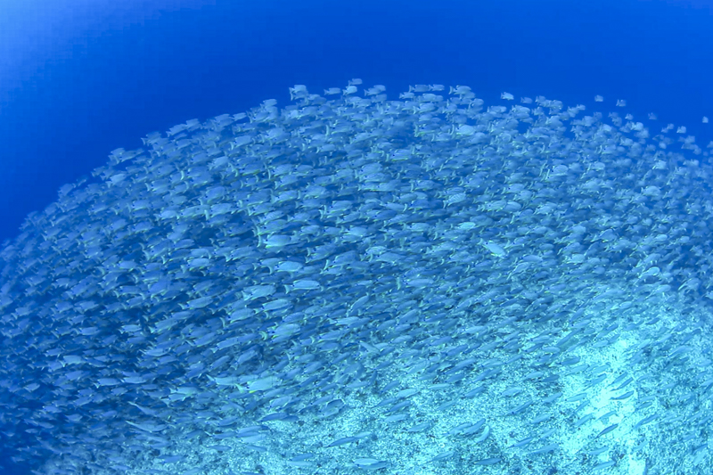 Während der Tauchgänge darf man mit viel Großfisch rechnen. Große Schulen von Grauhaien sind keine Seltenheit, es werden Manta Plätze besucht und auch andere Haiarten wie Zitronenhaie, Tigerhaie und diverse Riffhaie stehen an der Tagesordnung. Die Begegnung mit Adlerrochen, Mantas und zutraulichen Stachelrochen ist sehr wahrscheinlich. Schildkröten sowie Delfine kann man eigentlich fast garantieren. Berühmt sind auch die außergewöhnlich riesigen Fischschwärme und teils atemberaubende Korallenlandschaften.