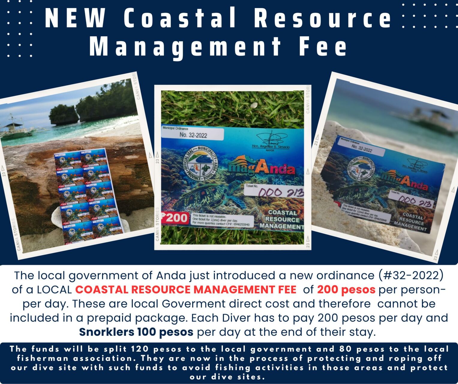 Philippinen: Wir möchten Sie darauf hinweisen, dass die lokale Regierung von ANDA vor kurzem eine Gebühr von 200 Pesos (ca. 3,- €) für Taucher und 100 Pesos für Schnorchler pro Tag für das Management der Küstenressourcen eingeführt hat.