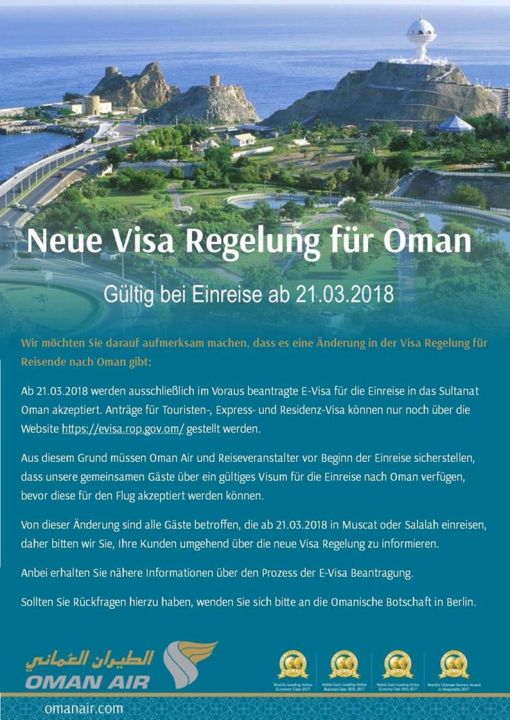 Ab dann können Touristen nur noch mit einem gültigem Visum einreisen, ab diesem Zeitpunkt ist ein Visum bei Ankunft nicht mehr möglich. Anträge für Tourist, Express & Residence Visa können dann nur noch über die Website www.evisa.rop.gov.om beantragt werden.