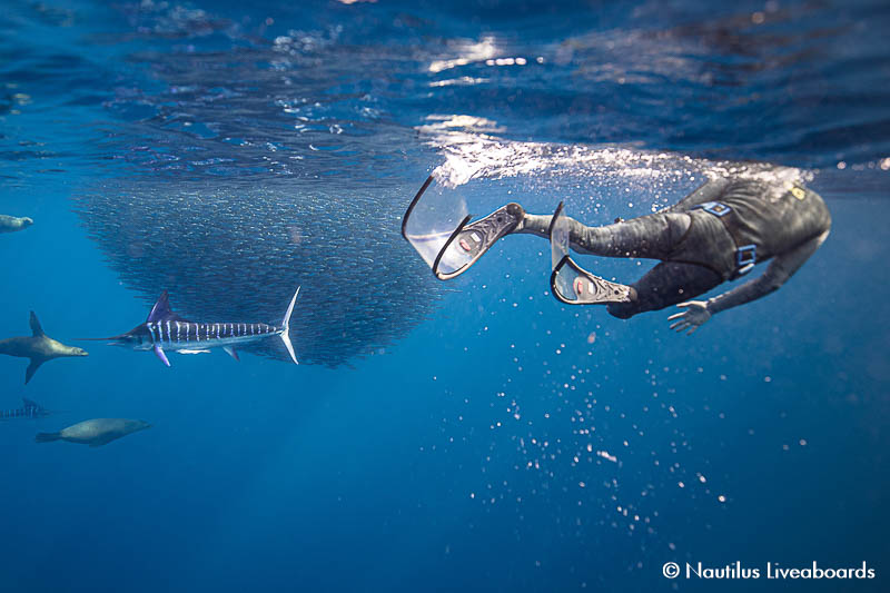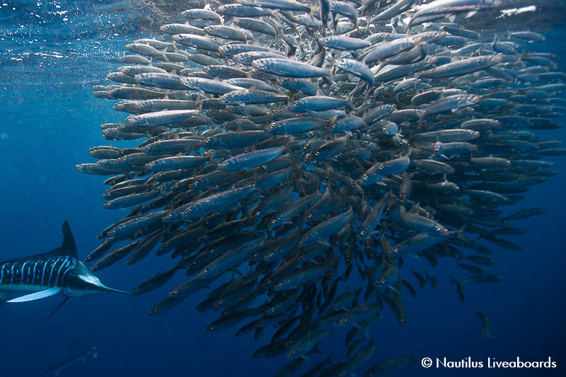 Tipp: Wir haben immer wieder Sonderreisen zu Terminen, wo die Baitball-Saison voll im Gange ist, und es gibt mehr Riesenmantas und mehr Biomasse in Socorro als zu jeder anderen Zeit des Jahres. Alles intensiviert sich mit mehr Haien – einschließlich Seidenhaischulen, Hammerhaischulen, Walhaien, viel Thunfisch und anderen pelagischen Fischen und sogar Pilotwalen. Zu unseren Socorro-Sonderreisen!